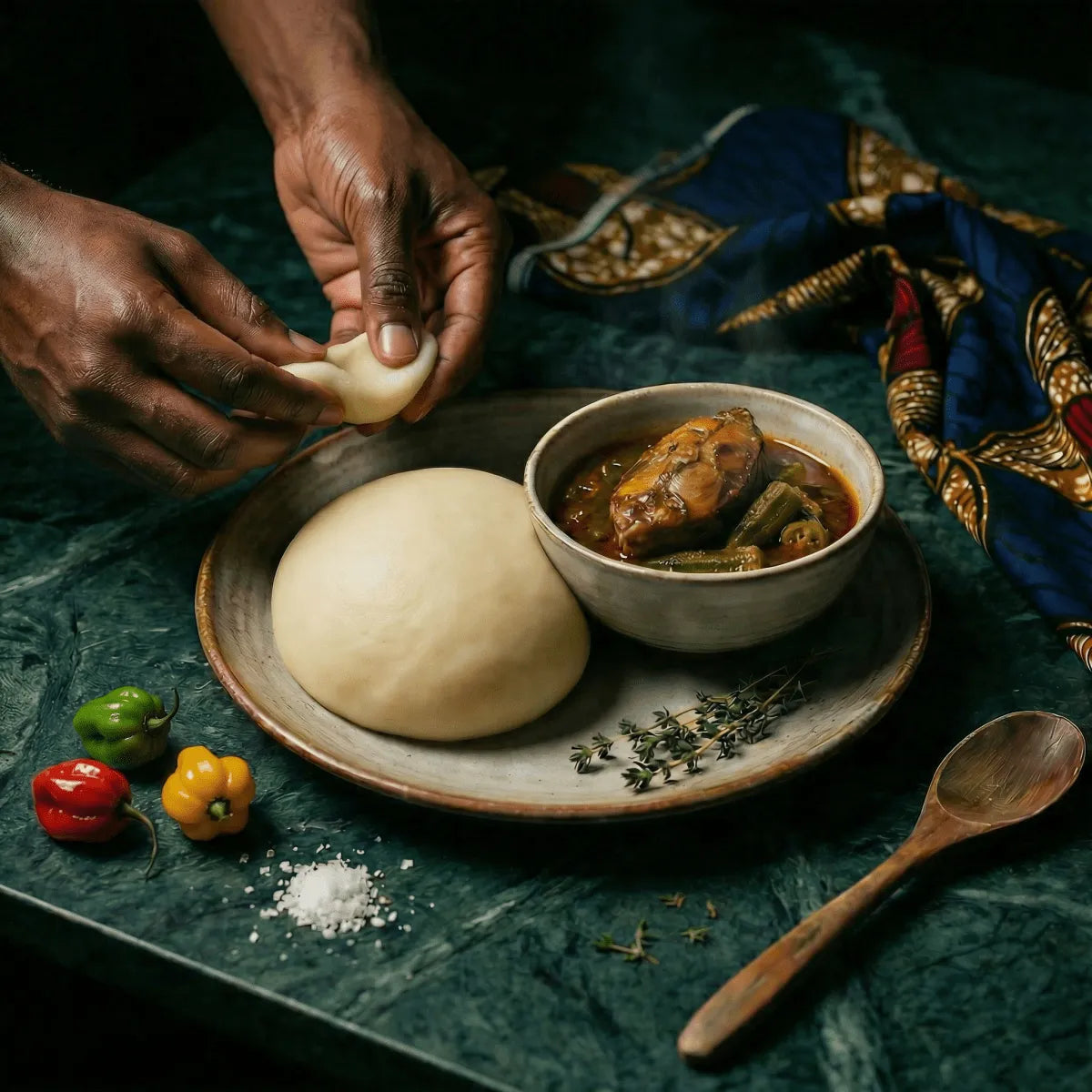 Le Authentique de Foufou de Manioc prend ses racines en Afrique de l'Ouest et centrale. On le retrouve principalement au Cameroun, au RDC, au Congo-Brazzaville, en Cote d'Ivoire et au Ghana. Il fait partie intégrante du patrimoine culinaire local et continue d’être transmis de génération en génération, des cuisines familiales jusqu’aux tables des restaurants de la diaspora afro-caribéenne en France.