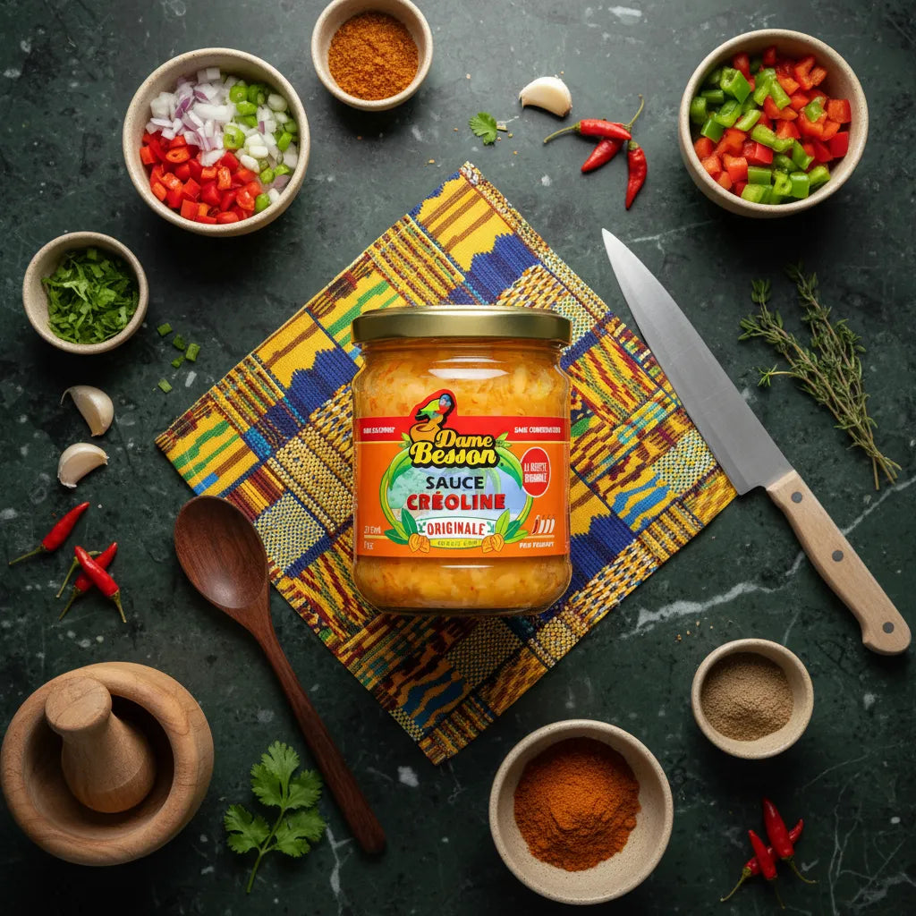 Entdecken Sie die würzige creolische Sauce DAME BESSON, eine wahre Reise der Sinne dank ihrer samtigen Textur und ihrem ausgewogenen Geschmack. Ursprünglich aus der Karibik, wurde diese einzigartige Sauce entwickelt, um Ihre täglichen Gerichte mit einer exotischen und würzigen Note zu veredeln.