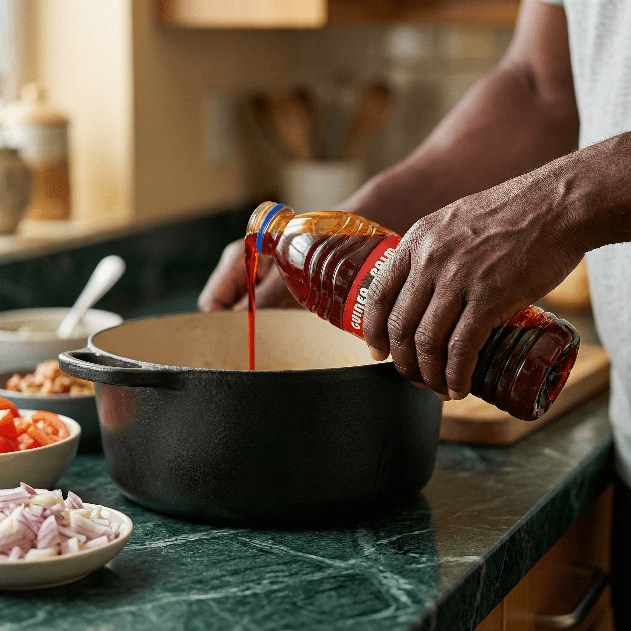 Pour révéler toutes ses saveurs, utilisez l'huile de palme pour faire revenir vos oignons et épices en début de cuisson. Elle est parfaite pour la préparation de plats comme le Mafe, le Thiéboudienne ou le Garri, et donne une profondeur incomparable à vos sauces mijotées.