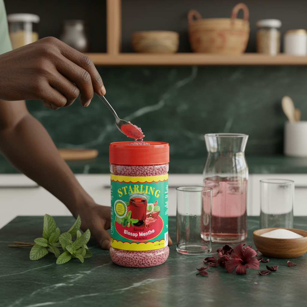 Journey of the Senses: Escape with the instant STARLING mint bissap tea, an exquisite blend that combines the invigorating freshness of mint with the floral and slightly tangy note of hibiscus, known as bissap. This unique combination promises a moment of delight, whether enjoyed hot or cold.