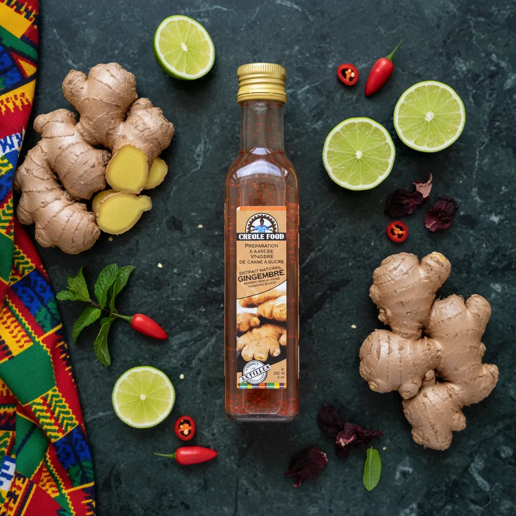 Discover the CREOLE FOOD cane vinegar with ginger, a true taste journey that combines the natural sweetness of cane sugar with the sharp and slightly spicy flavor of ginger. This vinegar, with its fluid texture and golden color, stands out as an essential ingredient to enhance your culinary creations.