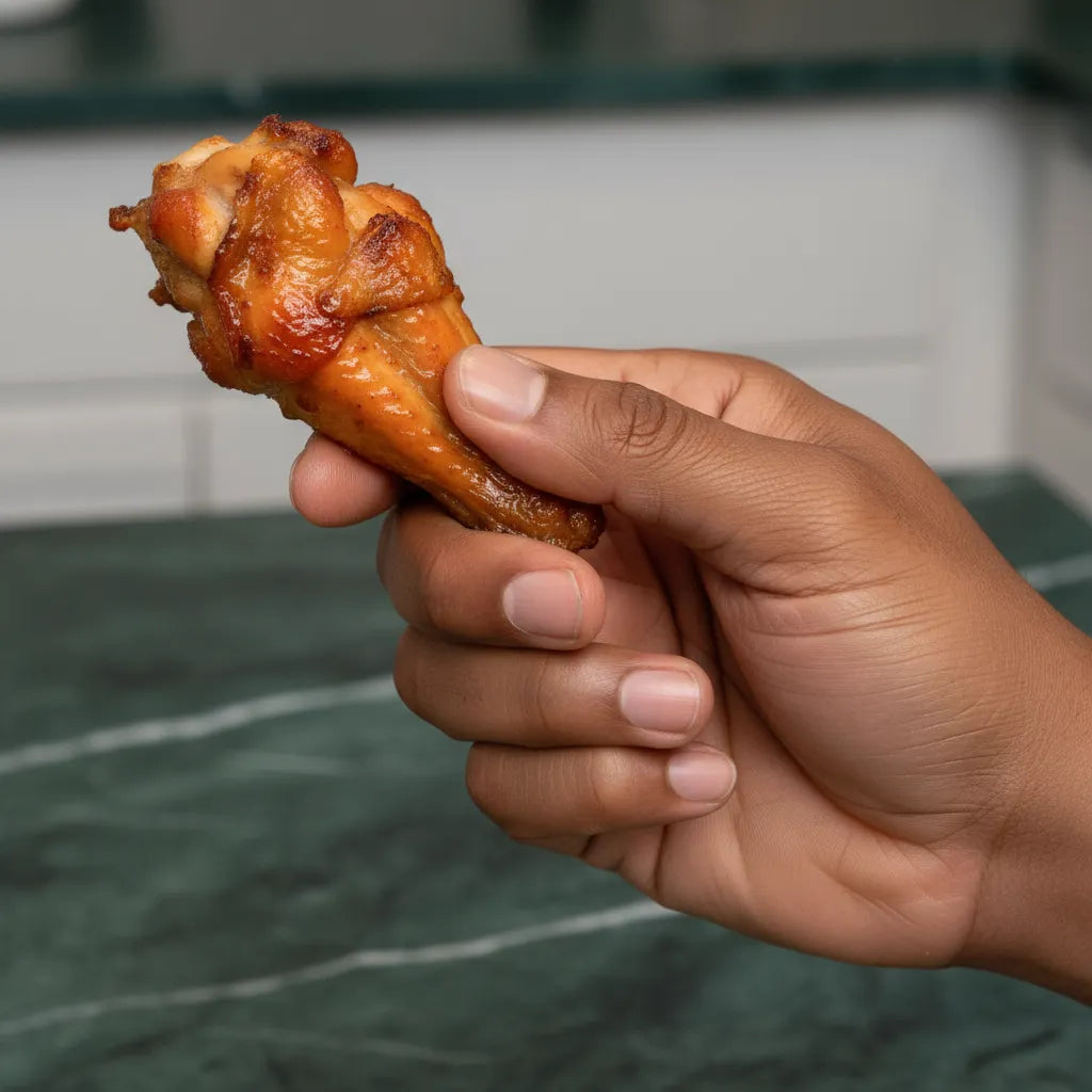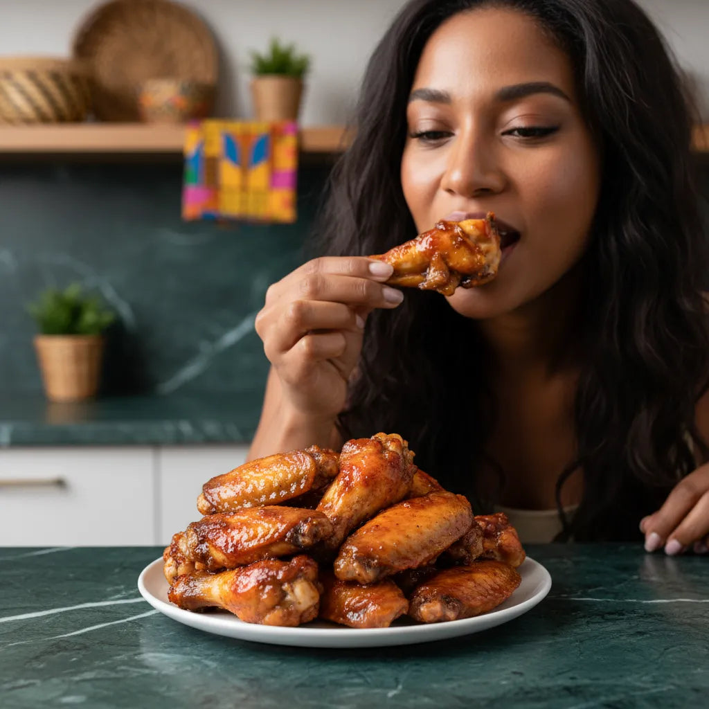 Les ingrédients comprennent : ailes de poulet, paprika, piment en poudre, cumin, ail en poudre, oignon en poudre, sel, poivre noir, et une touche de sucre brun pour caraméliser légèrement la peau lors de la cuisson. Informations nutritionnelles (pour 100g) : Énergie : 240 kcal, Protéines : 20g, Glucides : 2g, dont sucres : 1g, Lipides : 17g, dont acides gras saturés : 5g, Fibres alimentaires : 0g, Sel : 1,2g.