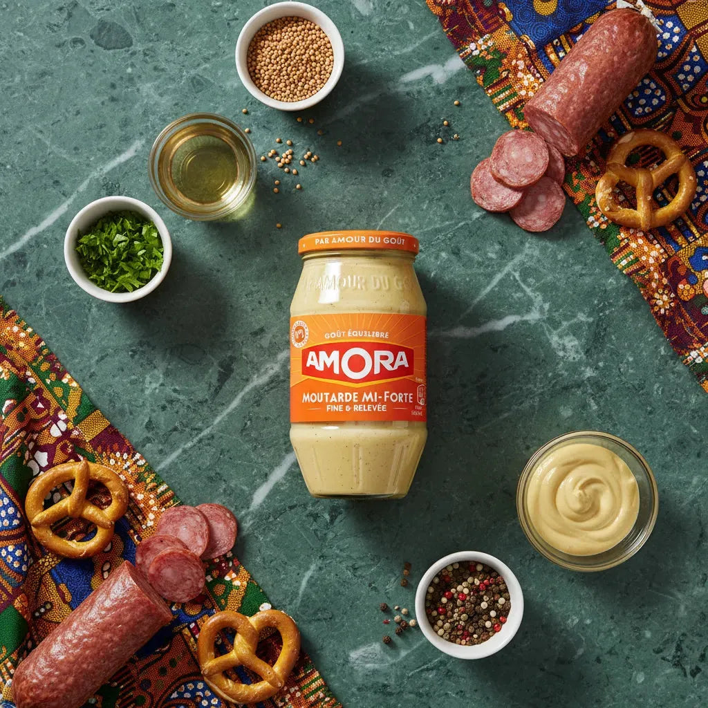 La Mostaza semi-fuerte AMORA se distingue por su equilibrio perfecto entre picante y dulzura, gracias a su fabricación a partir de semillas de mostaza de calidad superior.