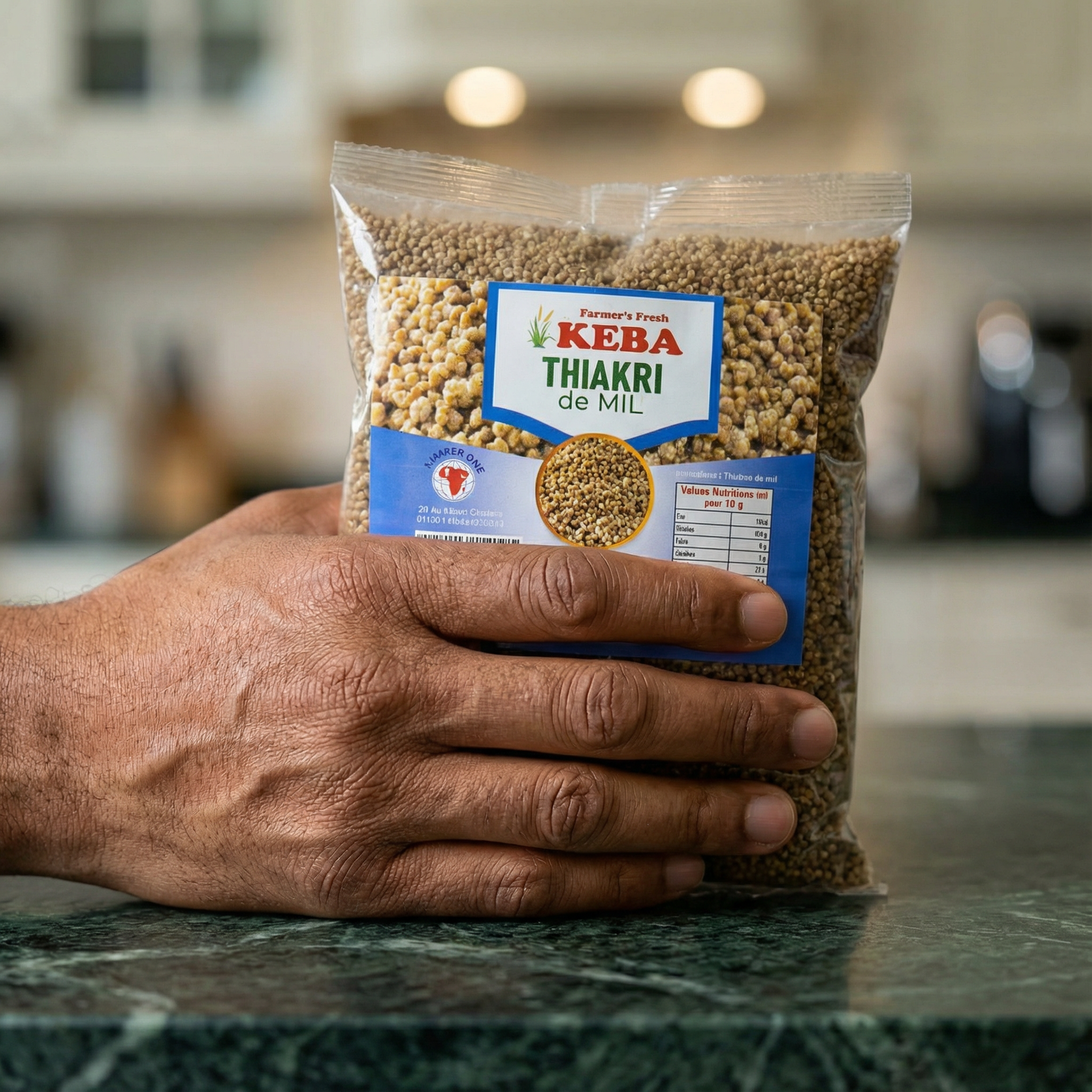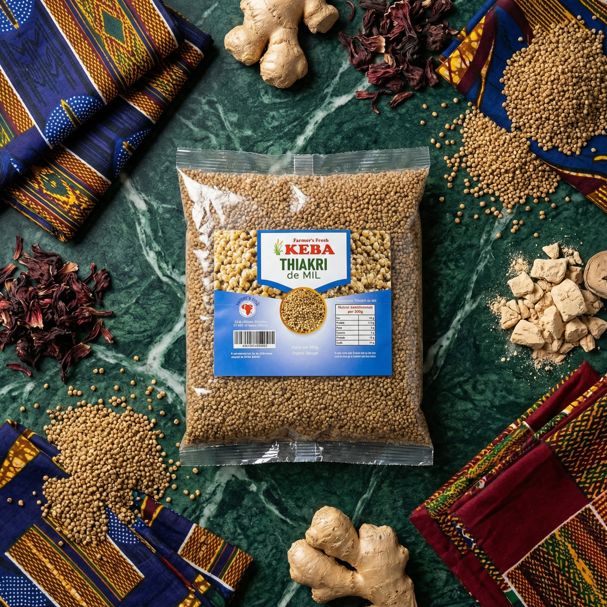 Embarquez pour un voyage sensoriel avec le Thiakri de mil KEBA, un dessert traditionnel d'Afrique de l'Ouest qui enchante les palais par sa simplicité et sa richesse. Préparé à partir de mil précuit de qualité supérieure, ce Thiakri est une invitation à découvrir les saveurs authentiques et réconfortantes de la cuisine africaine.