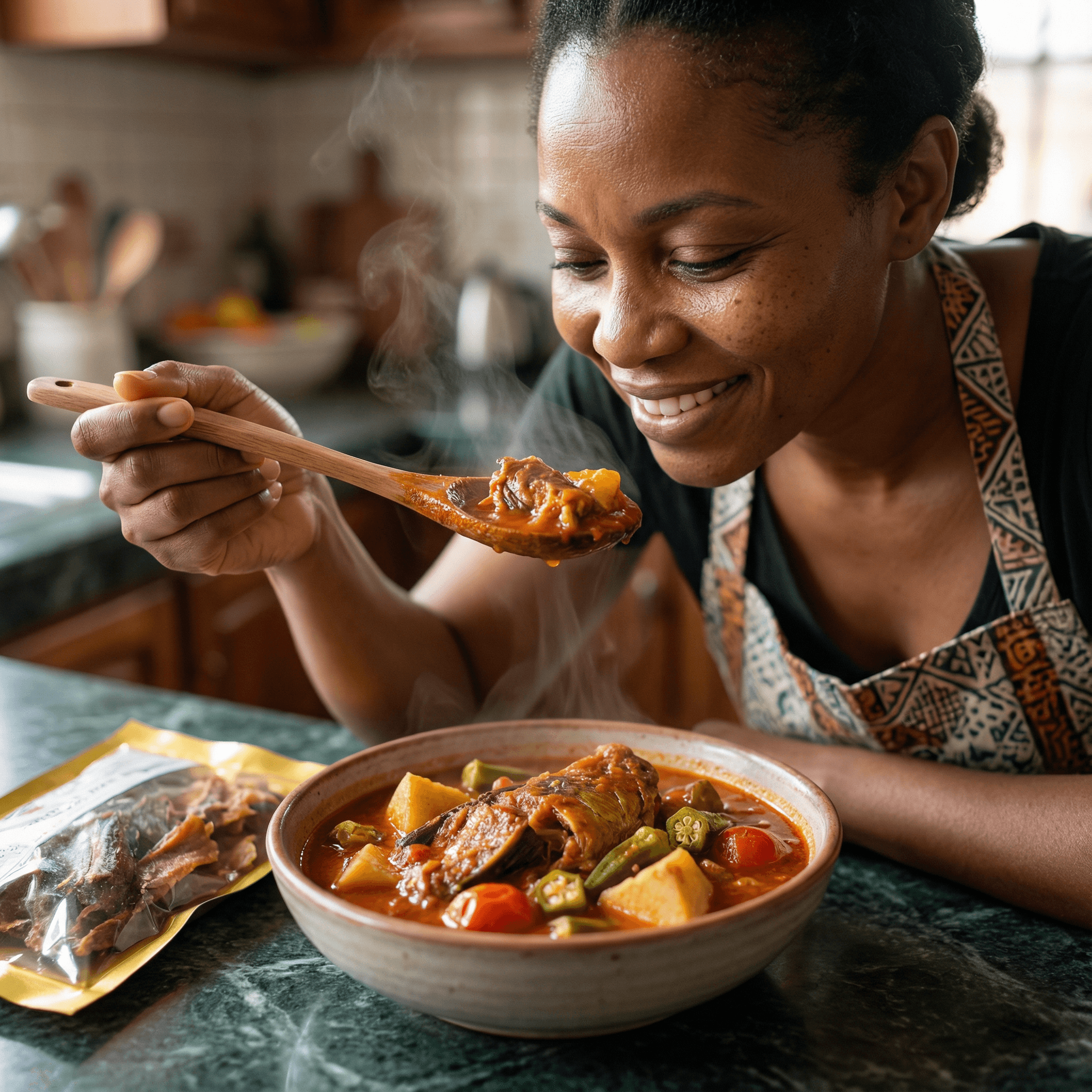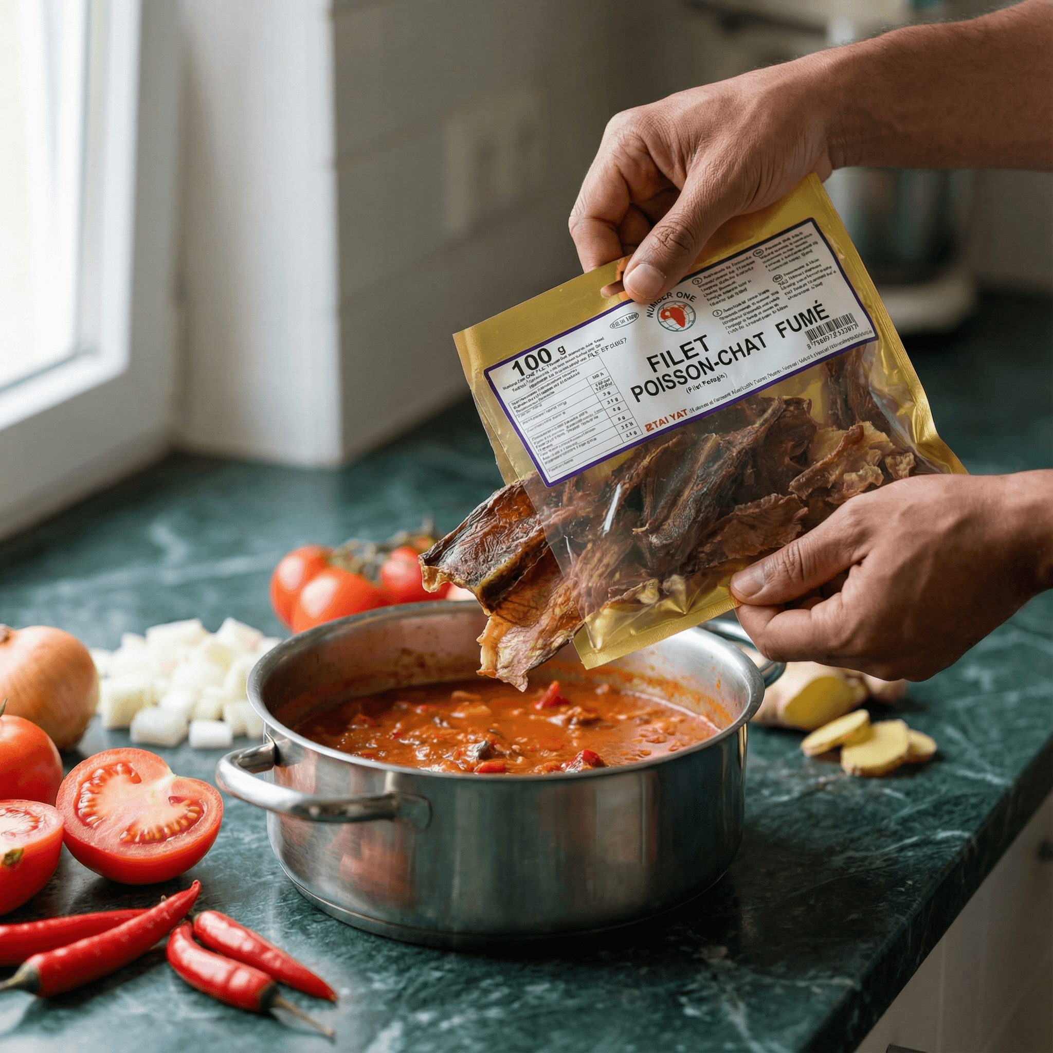 Pour libérer toutes ses saveurs, réhydratez le poisson chat fumé quelques minutes dans de l'eau chaude avant de l'ajouter à vos soupes, ragoûts (comme le Egusi ou le Gombo) ou vos sauces. Il se marie merveilleusement avec les légumes racines et les épices africaines, créant des plats réconfortants et inoubliables.