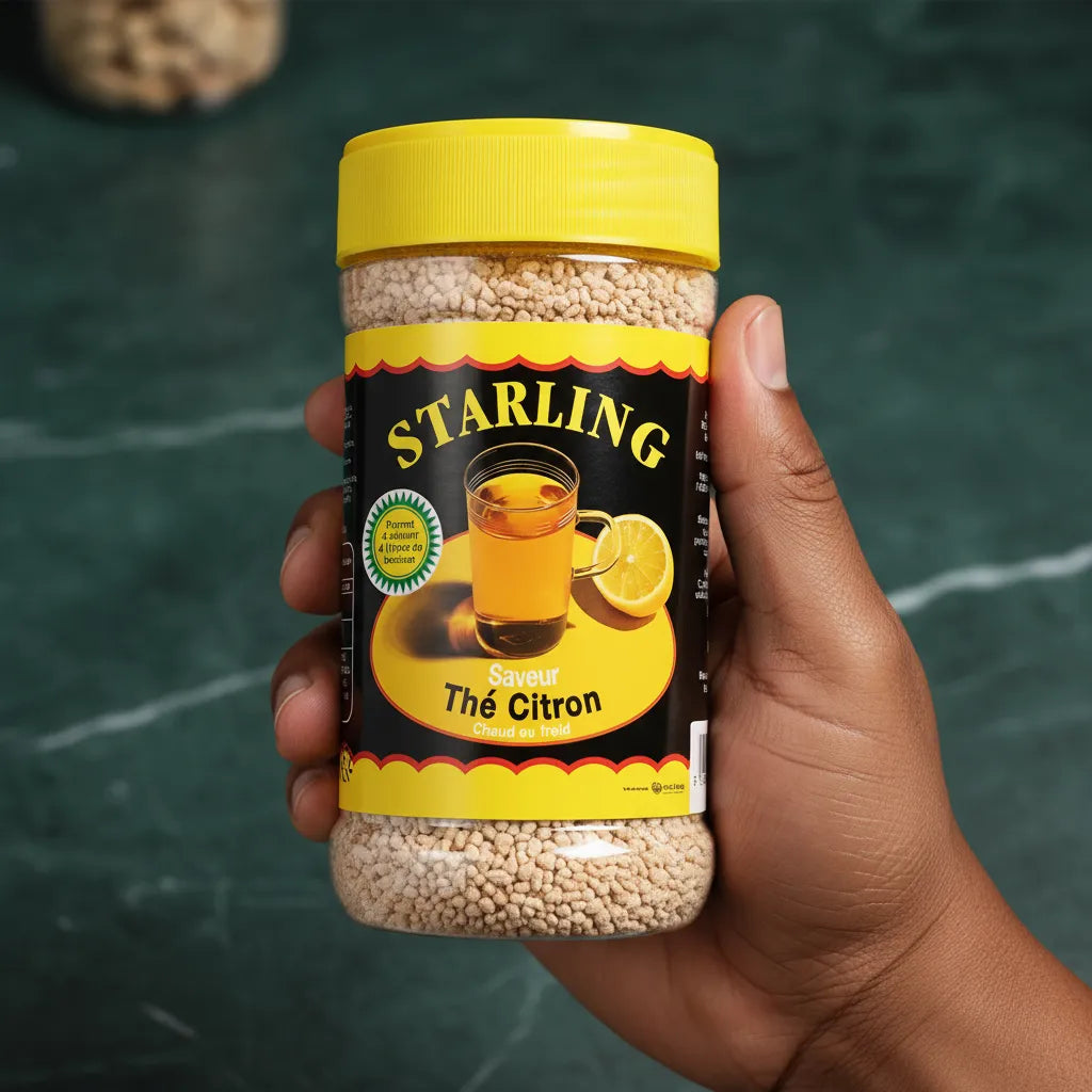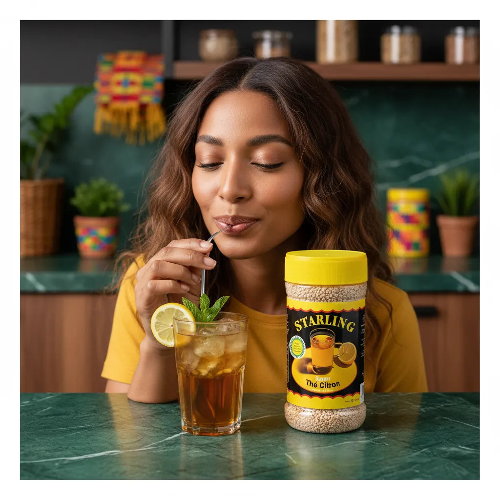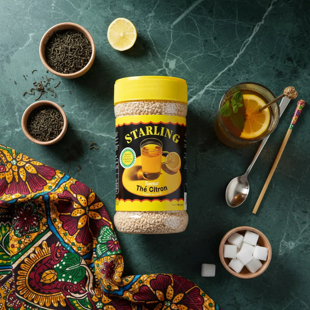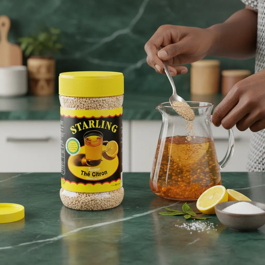 Le thé au citron STARLING est composé d'un mélange soigneusement sélectionné de feuilles de thé, d'arômes naturels de citron et d'édulcorants. Chaque ingrédient a été choisi pour offrir un goût équilibré et agréable, permettant ainsi une expérience gustative satisfaisante. Pour une portion (1 cuillère à café) de thé au citron STARLING, les valeurs nutritionnelles sont les suivantes : Calories : 20 kcal Lipides : 0 g Glucides : 5 g Sucres : 4 g Protéines : 0 g