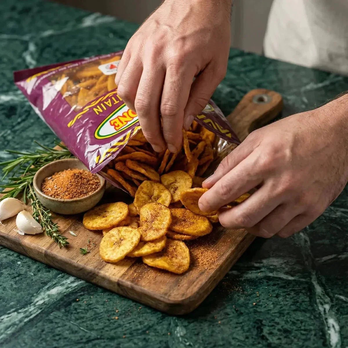 Ook ontdekken: ons recept voor plantainbanaankoekjes · Plantainchips met knoflook N°1 West-Afrikaanse chips · Gezouten plantainchips N°1 West-Afrikaanse chips