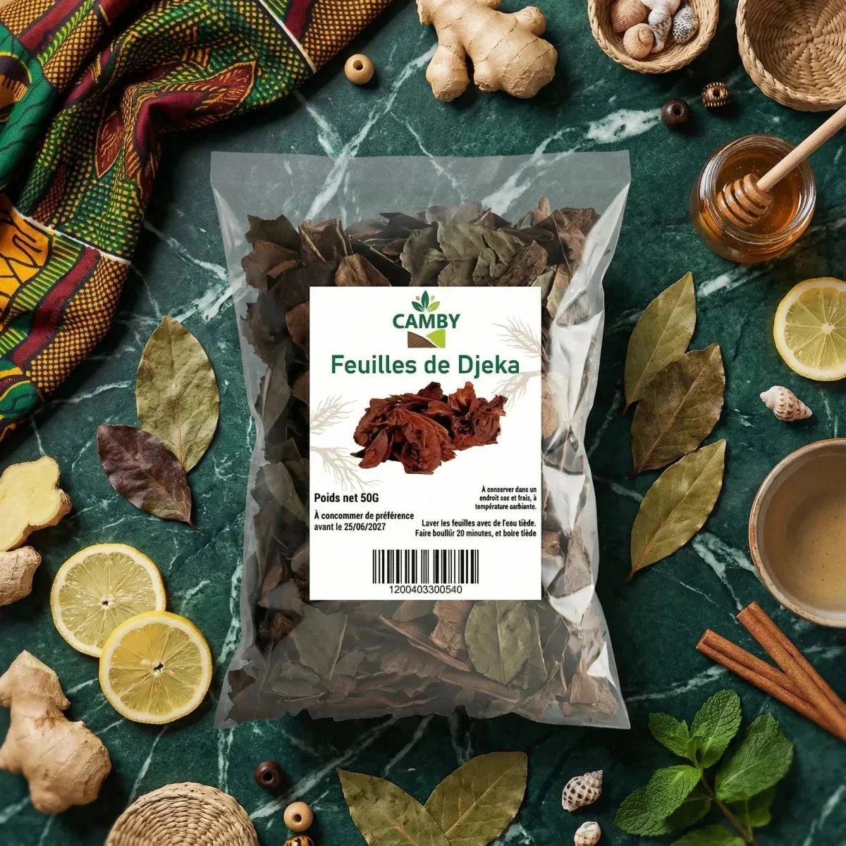 Ga mee op een unieke zintuiglijke reis met de Djeka CAMBY-bladeren, een eeuwenoud juweel uit de Afrikaanse kruidengeneeskunde. Deze traditionele medicinale plant wordt al generaties lang gebruikt vanwege haar erkende natuurlijke voordelen en haar rol in de Afrikaanse keuken.