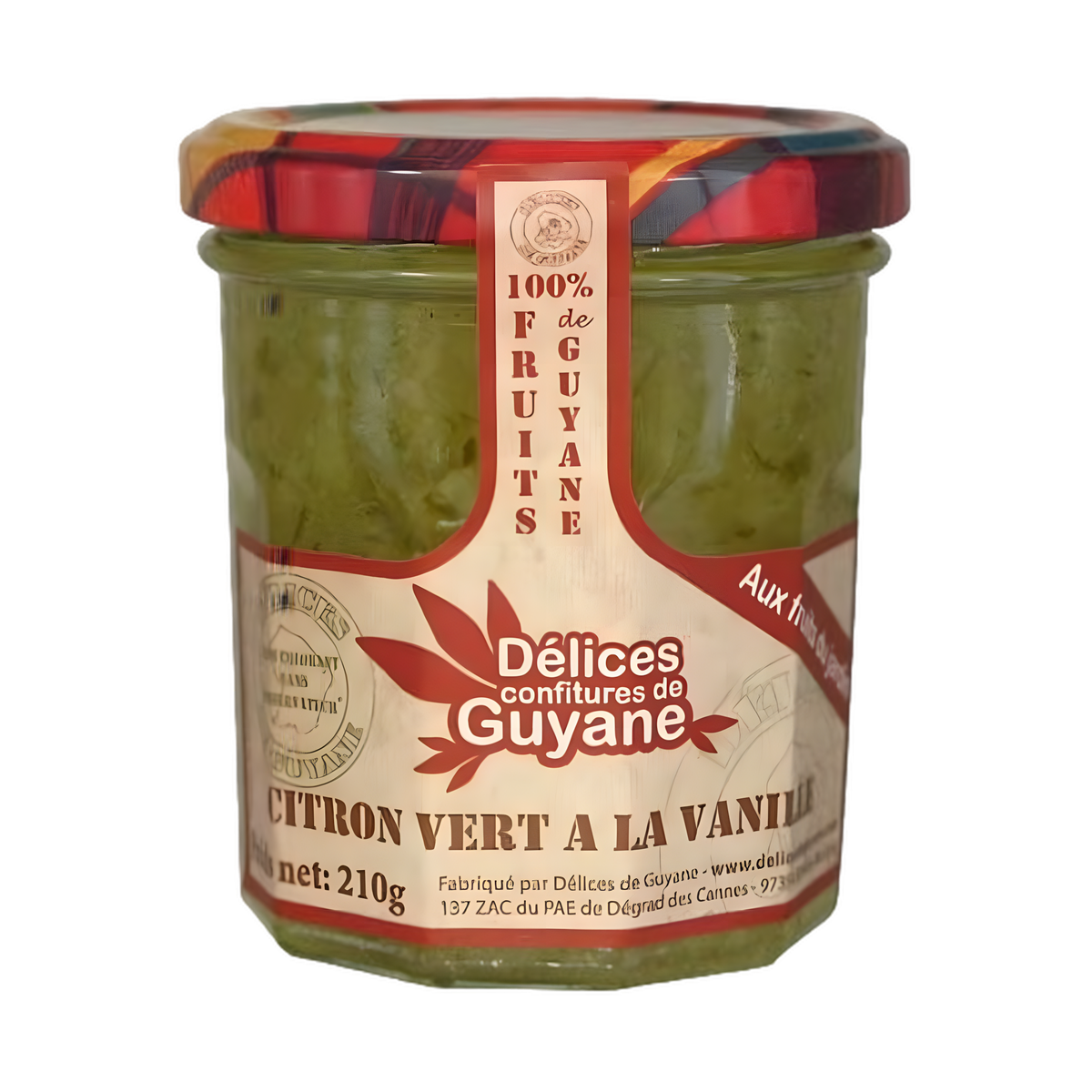 R : Citron vert, vanille, sucre, et éventuellement de la pectine.
