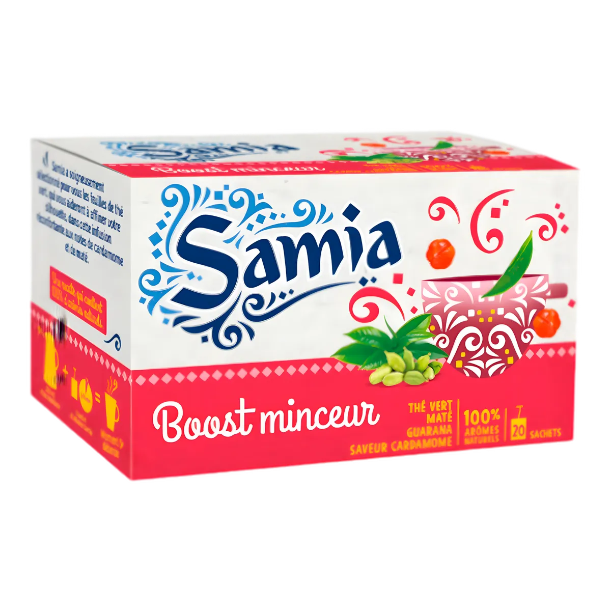 Boîte d'infusion minceur SAMIA Boost minceur avec thé vert, maté, guarana et cardamome, 20 sachets. Boisson naturelle pour bien-être.
