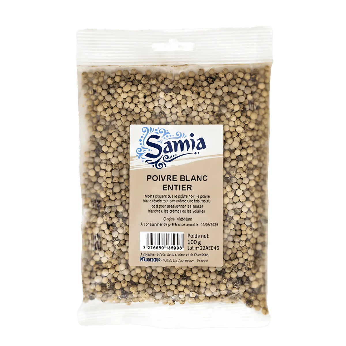 Voyage des Sens : Découvrez le poivre blanc entier SAMIA, une épice subtilement raffinée qui rehausse vos plats d'une saveur piquante incomparable. Originaire de terroirs sélectionnés avec soin, chaque grain de poivre incarne une note florale délicate, idéale pour émerveiller les papilles des connaisseurs comme des explorateurs culinaires.